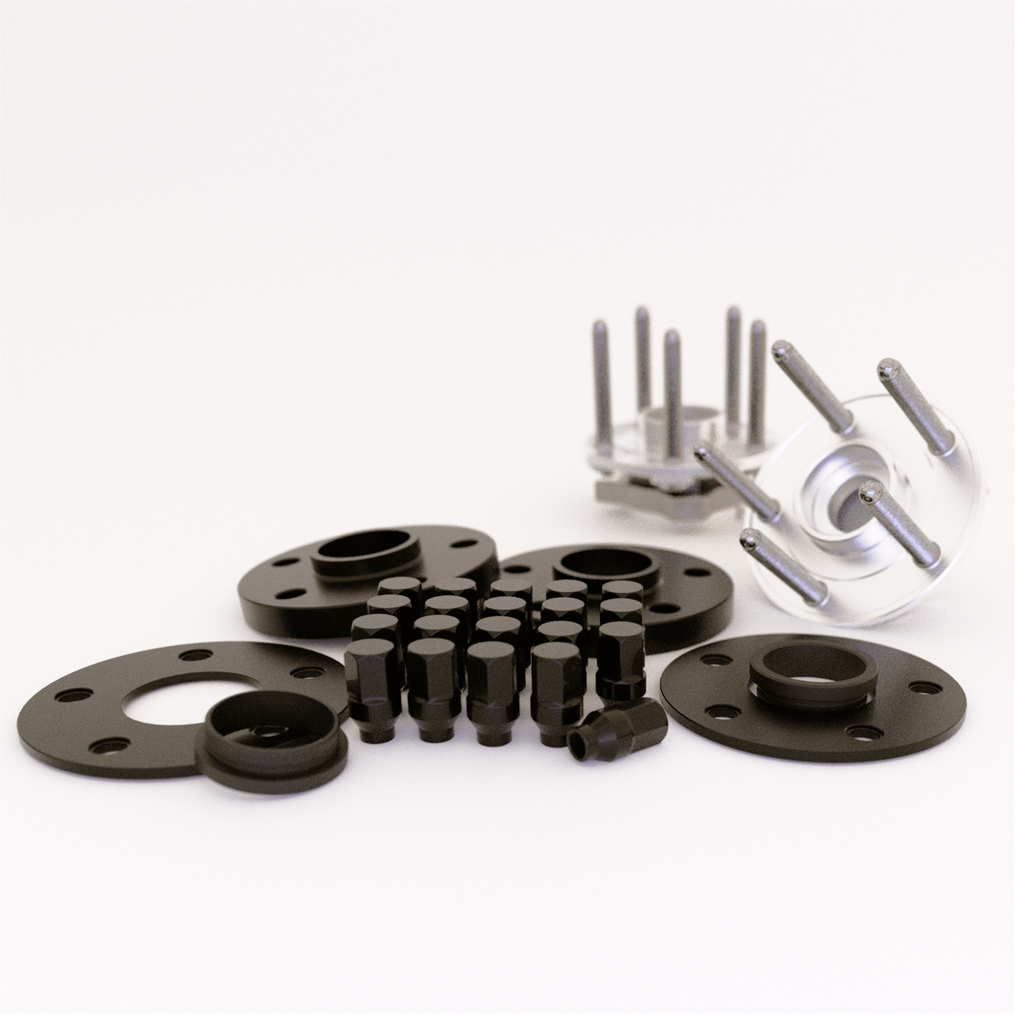 The full kit consists of a set of OE rear hubs with longer studs pressed in, a slip on spacer for the front and rear, a hub centric spacer for the front and 20 titanium lug nuts.